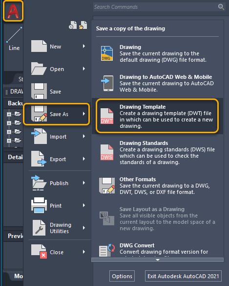 To save the drawing as a template: